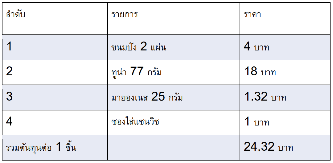 ส่วนผสมการทำแซนด์วิชทูน่ามายองเนส 1 ชิ้น