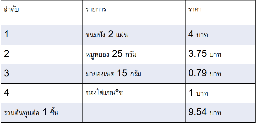 ส่วนผสมการทำแซนด์วิชหมูหยองมายองเนส 1 ชิ้น